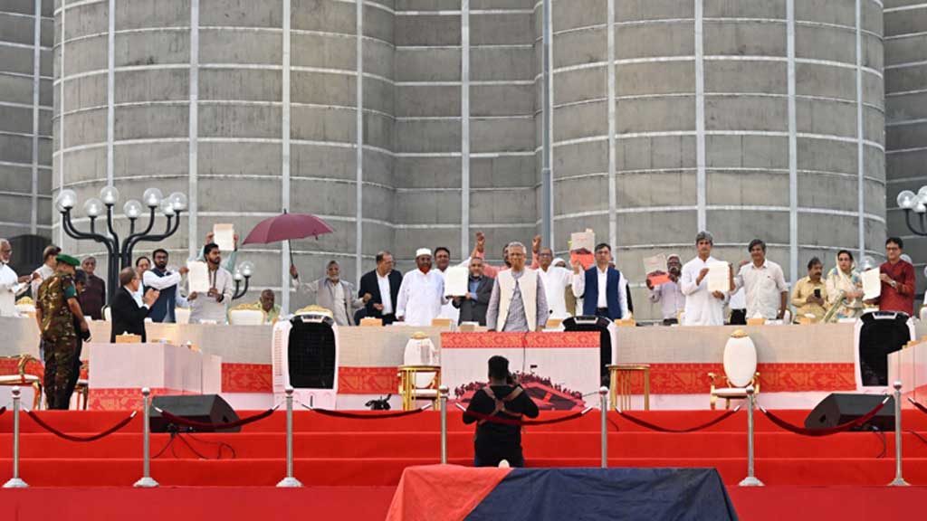 শুক্রবার বিকেল ৫টায় জাতীয় সংসদ ভবনের দক্ষিণ প্লাজায় ‘জুলাই জাতীয় সনদ ২০২৫’ স্বাক্ষরের এই আনুষ্ঠানিতা সারা হয়।